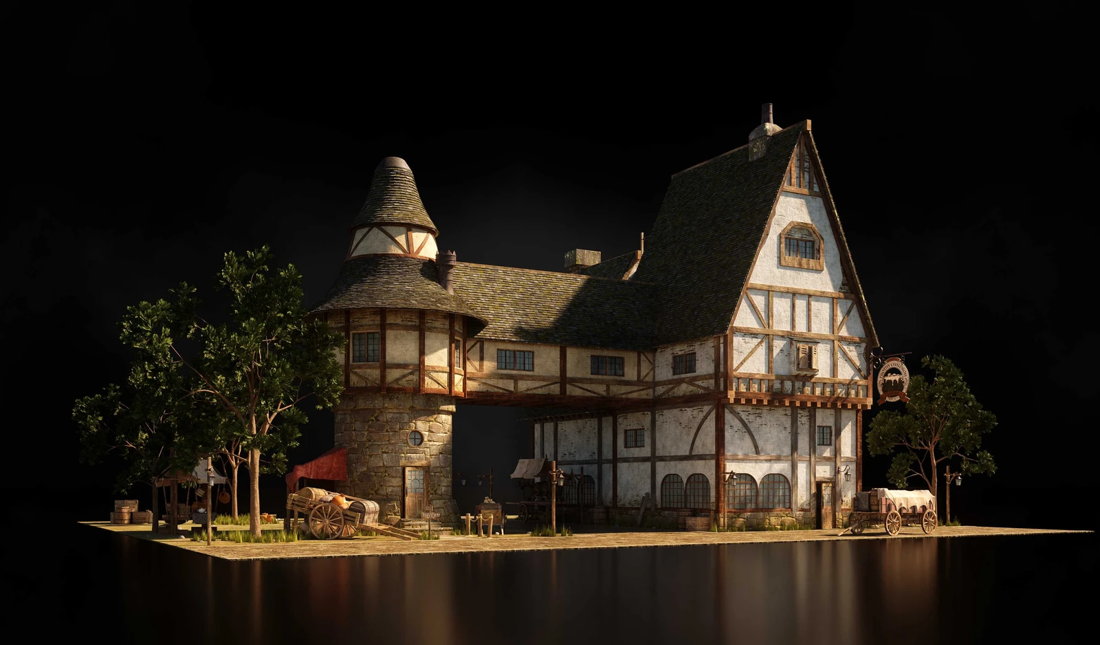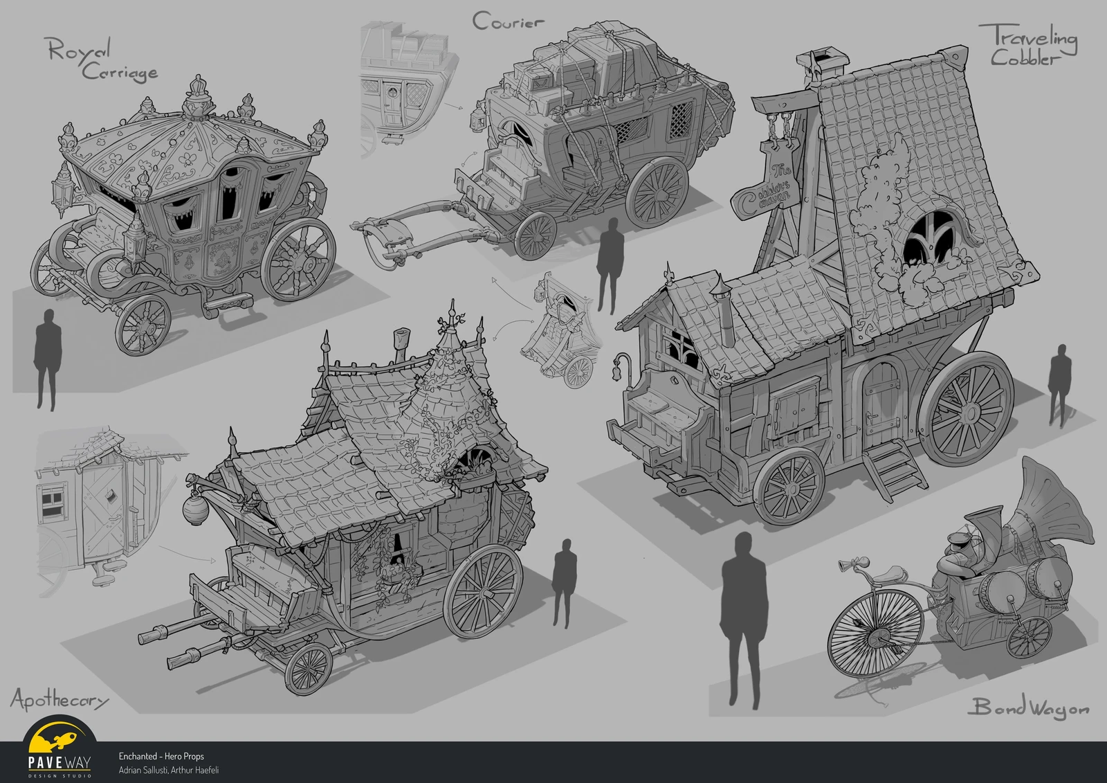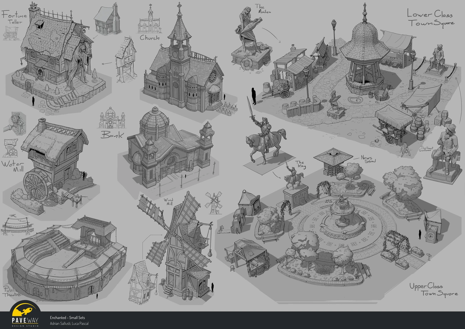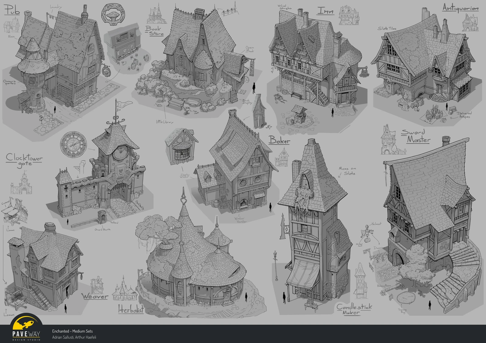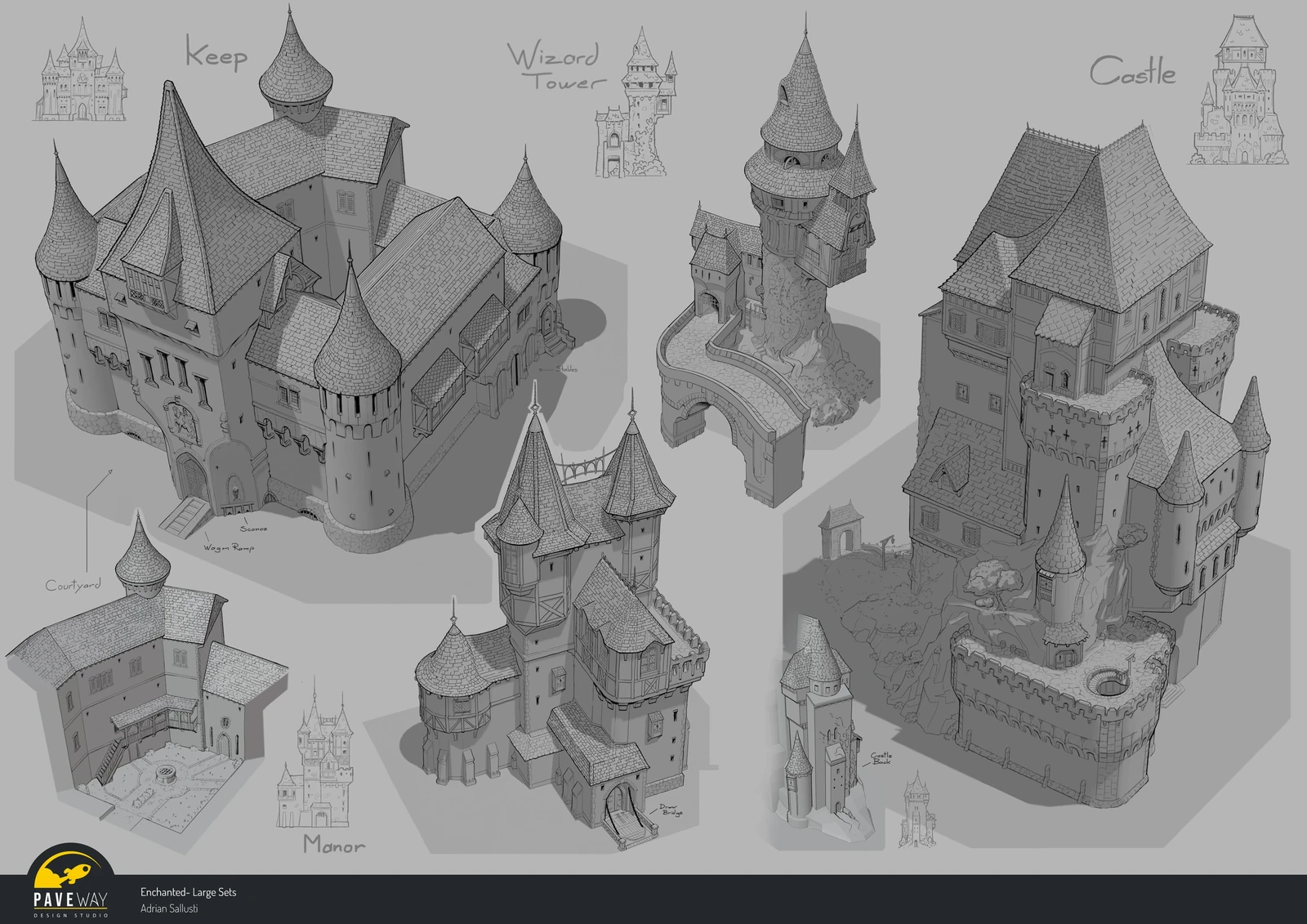 Designs I created for Kitbash 3Ds Enchanted. Started with a round of sketching and the chosen designs were blocked out in 3d, once those were aproved they were finished in line art.