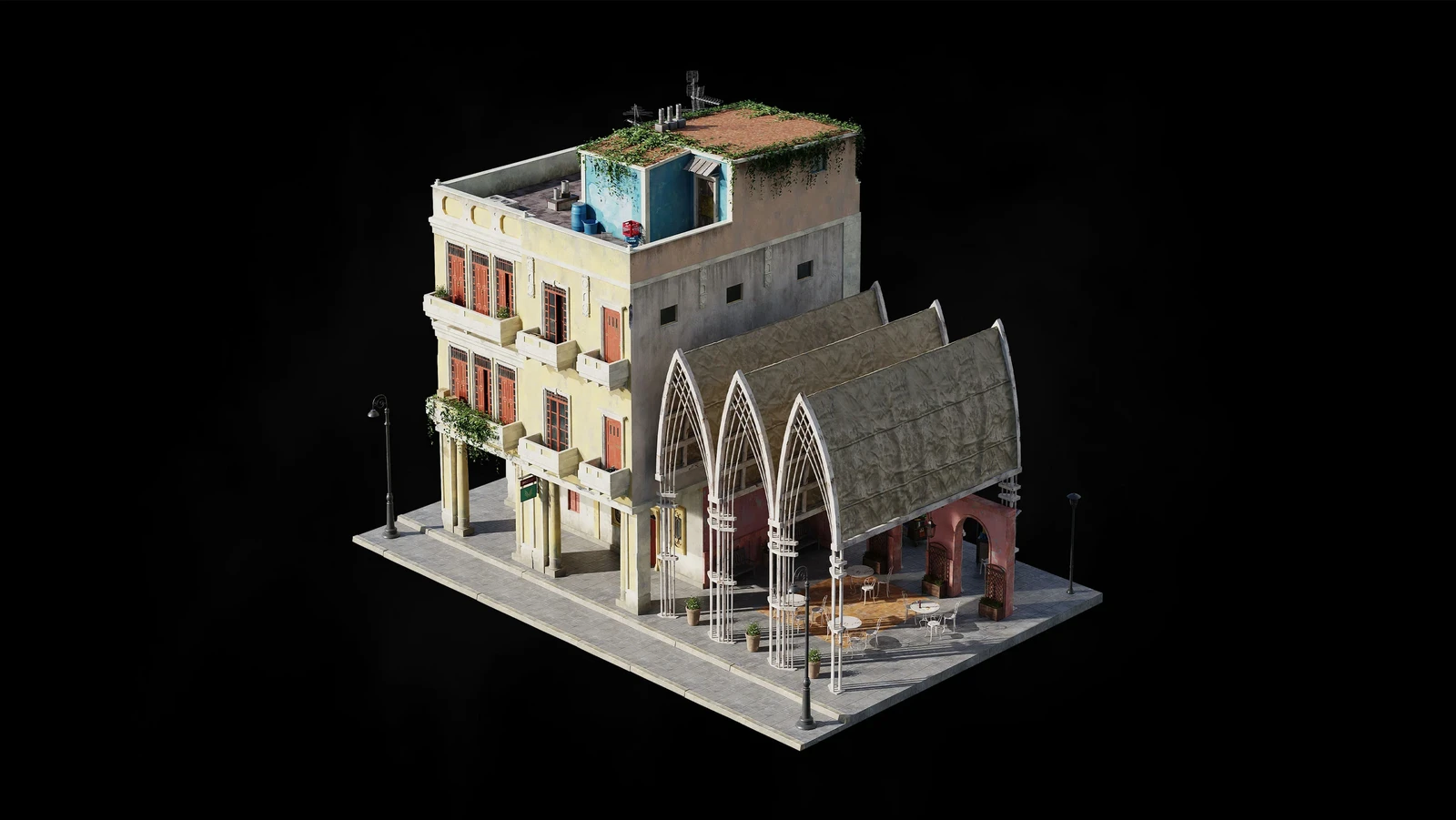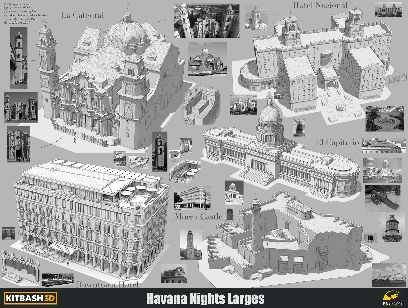 Designs I created for Kitbash 3Ds Havana Nights. Started with a round of sketching and the chosen designs were blocked out in 3d, once those were aproved they were finished in line art.